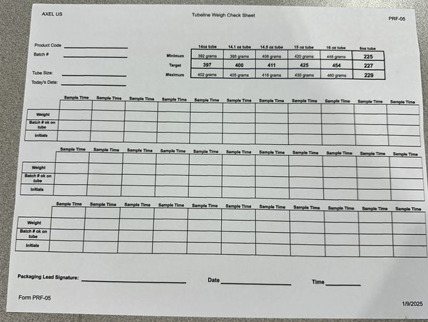 We keep all COA's on file for your products as well as file all batches filled and how many units of each batch. We also keep detailed weight sheets that shows the weight of samples taken from the line during production runs!
